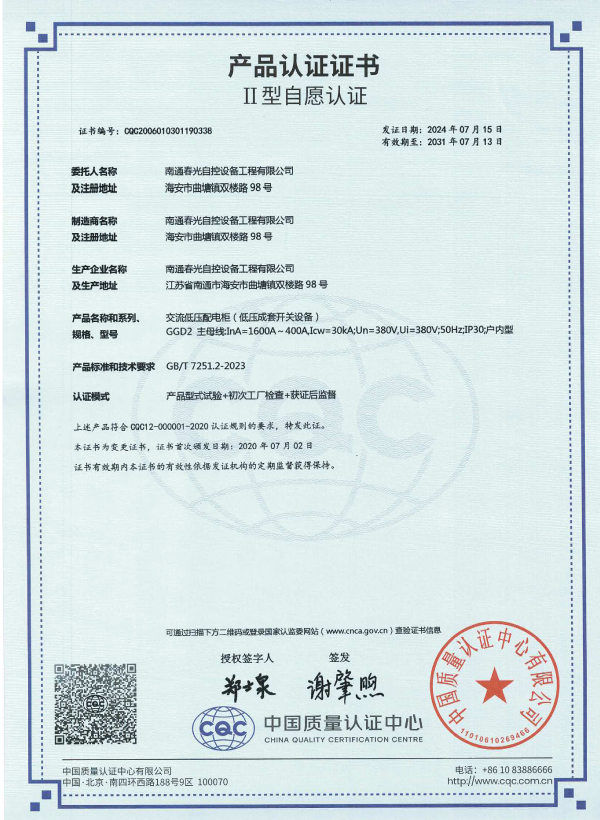 低壓抽出式開(kāi)關(guān)柜認(rèn)證證書(shū)